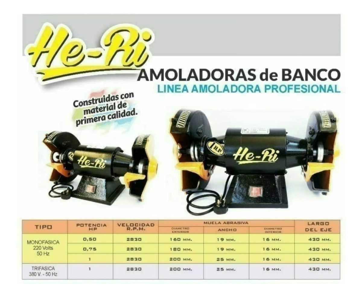 Amoladora de banco Chañar Linea He-Ri “profesional” 1 hp Monofásica.