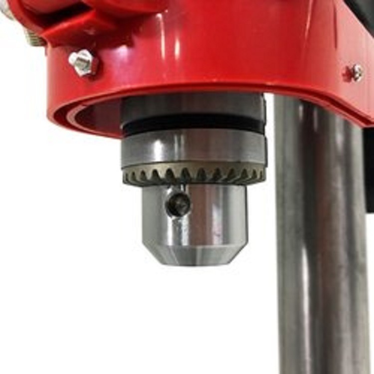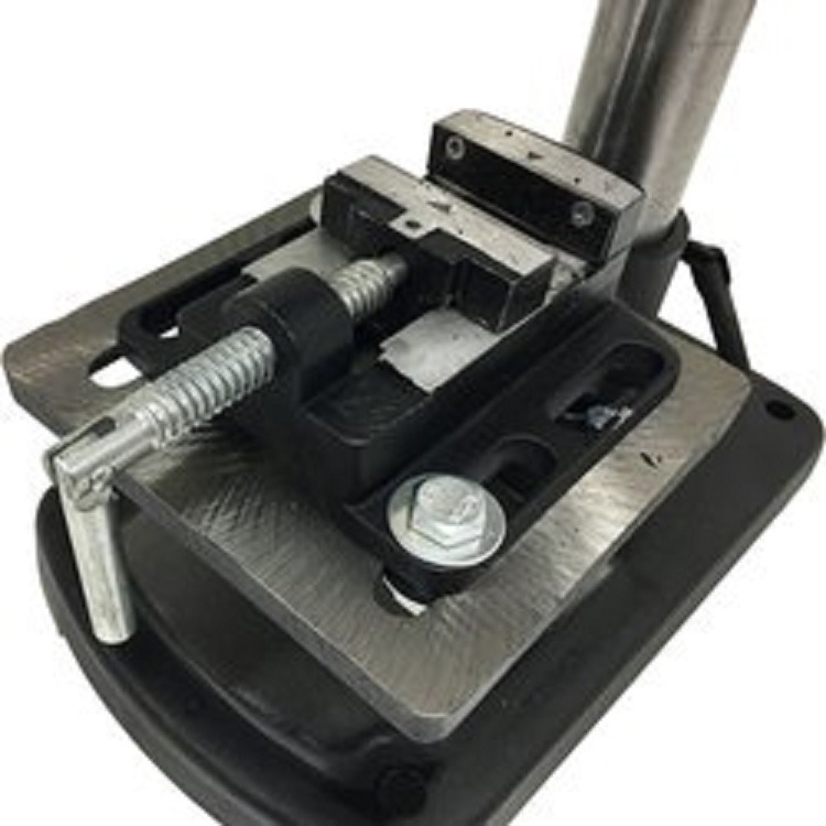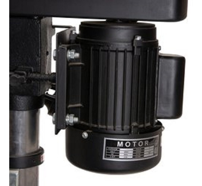 Incluye medidor de profundidad, mesa con inclinación graduada y elevación por cremallera, tensor de correa motora, guarda y morsa
